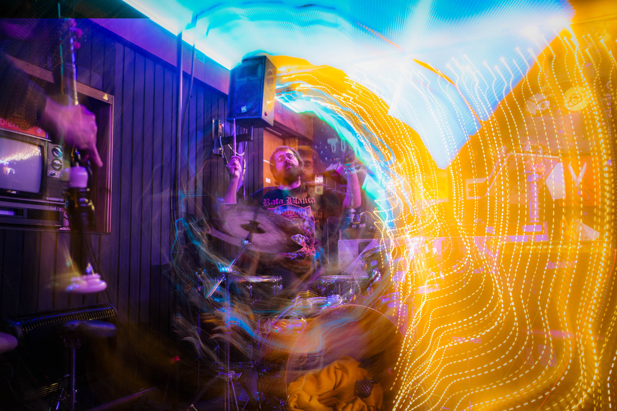 Tim Hill sat surrounded by a disarray of instruments, creating a psychedelia of sound.. https://brazenhead1.bandcamp.com/album/hammergags-and-hyperbreaths